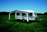 Передняя и боковые стенки палатки, а также гардины прекрасно сочетаются с жемчужно-серым цветом обоих караванов, а синяя отделка выигрышно подчеркивает декоративные наклейки на боковых стенках Eriba Nova GL.